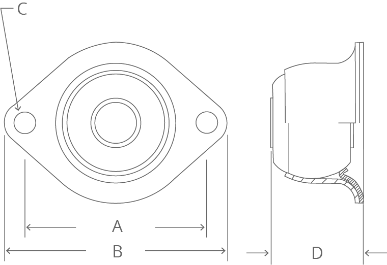 | Shaft Size | Oil | Grease Zerk | Ball Material | A | B | C | D | Mount Hole Shape | Static Load Capacity (lbf.) |